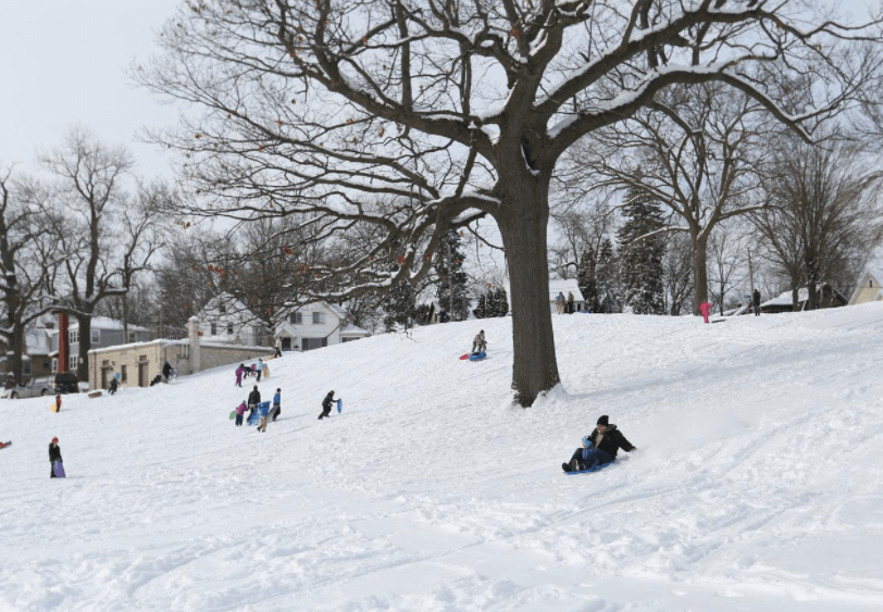 Olbrich Park has a great neighborhood vibe with a kid friendly sledding environment. It's not too large or steep for sledding. The park also has ice-skating with hockey rinks and a great view of the city of Madison. The area is lighted at night by the street lights for sledding.